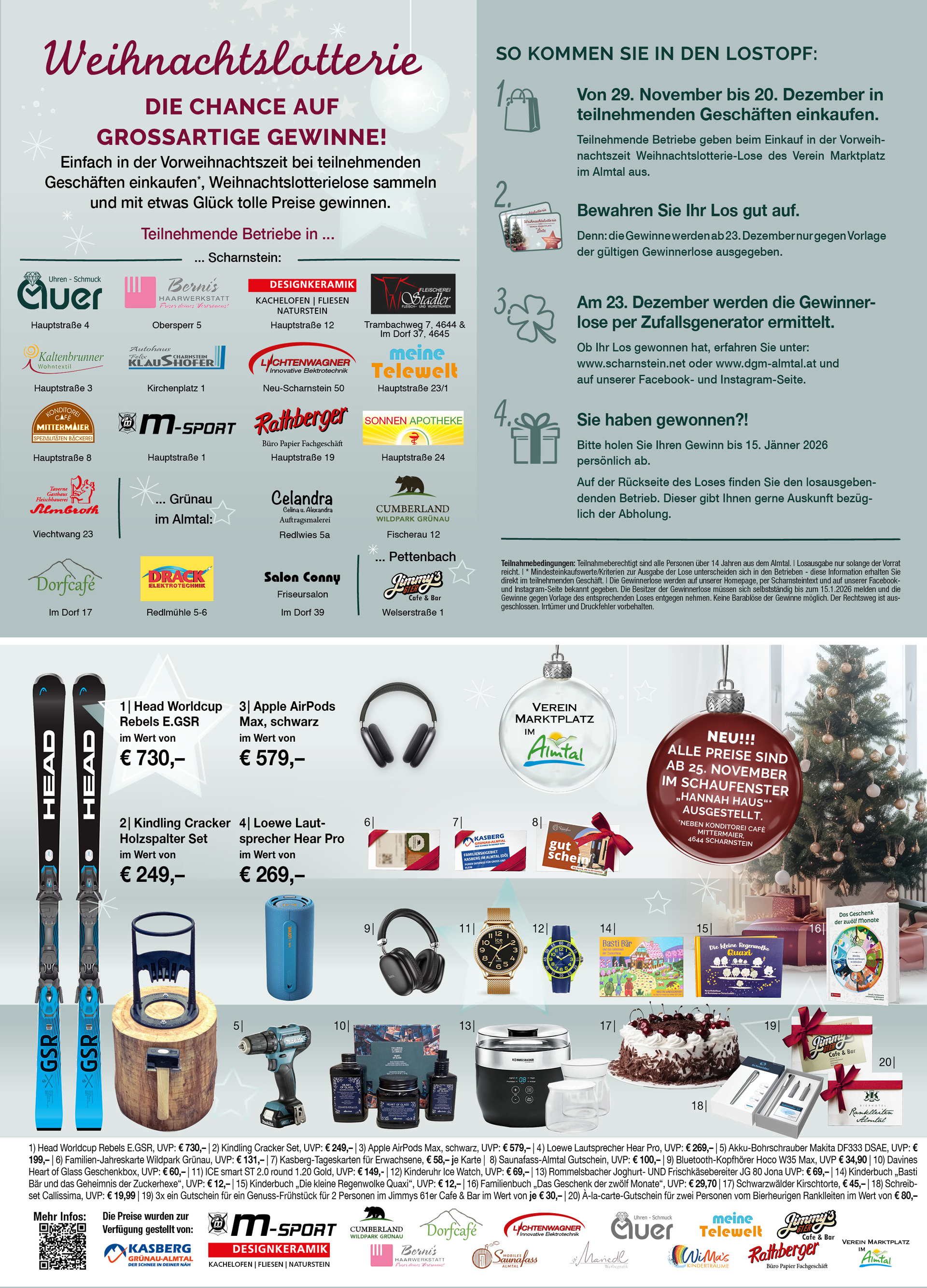 Ein herzliches Dankeschön an alle, die bei ihren vorweihnachtlichen Einkäufen regionale Betriebe unterstützt haben. Glückwünsche gehen an die Gewinner – wir freuen uns mit euch! Die Preise können bis 15. Jänner bei Elektro Lichtenwagner abgeholt werden. Bitte beachten: Die Ausgabe der Gewinne erfolgt nur gegen Vorlage der Lose.